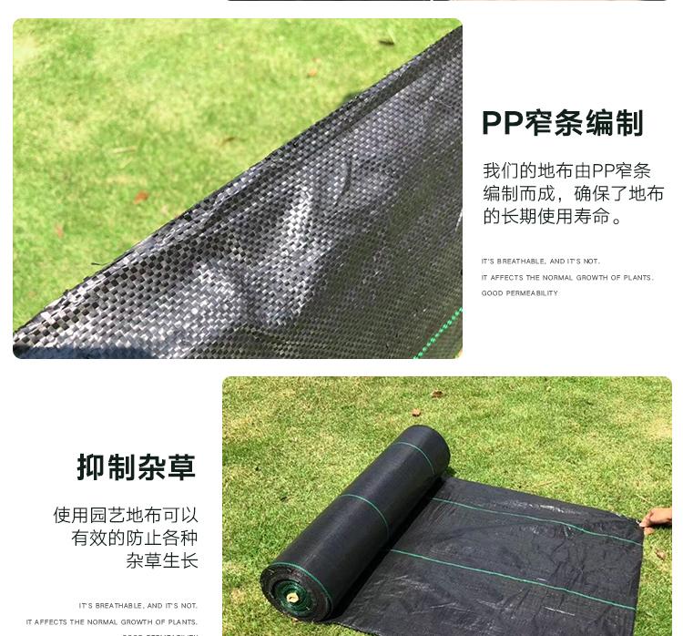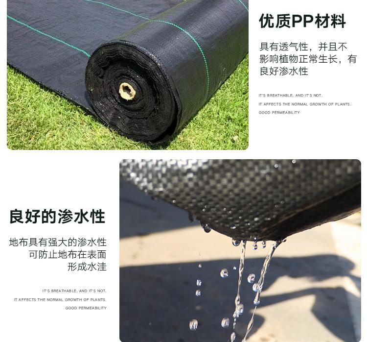 我公司生产的黑色抗老化防草布采用全新PP材料,经久耐用可有效抑制各种杂草的生长,并且透气性好,可有效防止种植植被的烂根现象,保证让您有一个意想不到的效果。